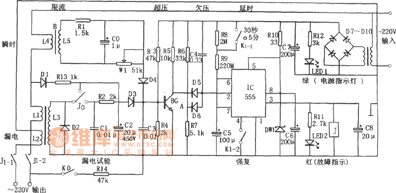Leakage detection circuit is composed of the L1, L2, L3, J1 and so on. The J1 is the leakage detection coil, the relay power from the JZ7-44 isconverted. Under normal circumstances, the current size on the L1, L2 are the same. The phases are contrast. There is no leakage voltage signal in L3. When there is electric shock or leakage occurs, the L3 balance will be destroyed due to the magnetic field induces a voltage signal leakage.