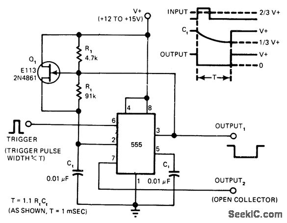 Circuit triggers on positive-going pulses and delivers negative-going output timing pulses. C1 charges when JFET switch a, is held on by high output state of timer. When output of timer goes low, Ct discharges to ground through Rt. Timing accuracy is good, and duty cycles above 99% are possible without jitter.-W. G. Jung, Take a Fresh Look at New IC Timer Applications, EDN Magazine, March 20, 1977, p 127-135.
