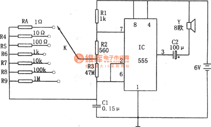 The core of circuit is a multivibrator composed of 555 and R1, R2, R3, Rx ( measured resistor ), C1, etc. The resistors R4 ~ R9 in circuit are the Estimating known resistors. The multivibrator output signals' period is T = 0.693 [ R1 +2 ( R2 + R3Rx / ( R3 + Rx ) ) ]. You can change the oscillation frequency by strobe switch K position, then the speaker issues different tone signals.