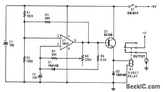 You can set the interval from about 5-30 seconds. A relay operates the slide-change mechanism. Op amp U1 forms a sort of Schmitt trigger. Resistors R1 and R2 bias the noninverting input at pin 3 of U1 to half the supply voltage. Feedback resistor R3 increases or reduces the bias to pin 3, depending on whether the output of U1 is high or low.When power is first applied to the circuit, C2 has a zero charge and the inverting input of the op amp is at a lower voltage than its noninverting input. When the output of U1 is high, C2 begins to charge through R5 and D1. It takes about one second for the charge on C2 to reach the same voltage as that at the noninverting input of U1. At that time, the output of U1 begins a negative swing.Because of the positive feedback through R3, the voltage at the noninverting input is reduced and the output becomes more negative. The voltage at the noninverting input is about 1/4 of the supply voltage, and C2 begins to discharge through the resistor bank. The timing is controlled by R6.The resulting pulses are fed to the base of Q1, configured as an emitter-following buffer stage, which is used to activate relay K1. Transistor Q1 is necessary because op amps usually have an output current in the 20-mA range, which is too low to activate the relay.