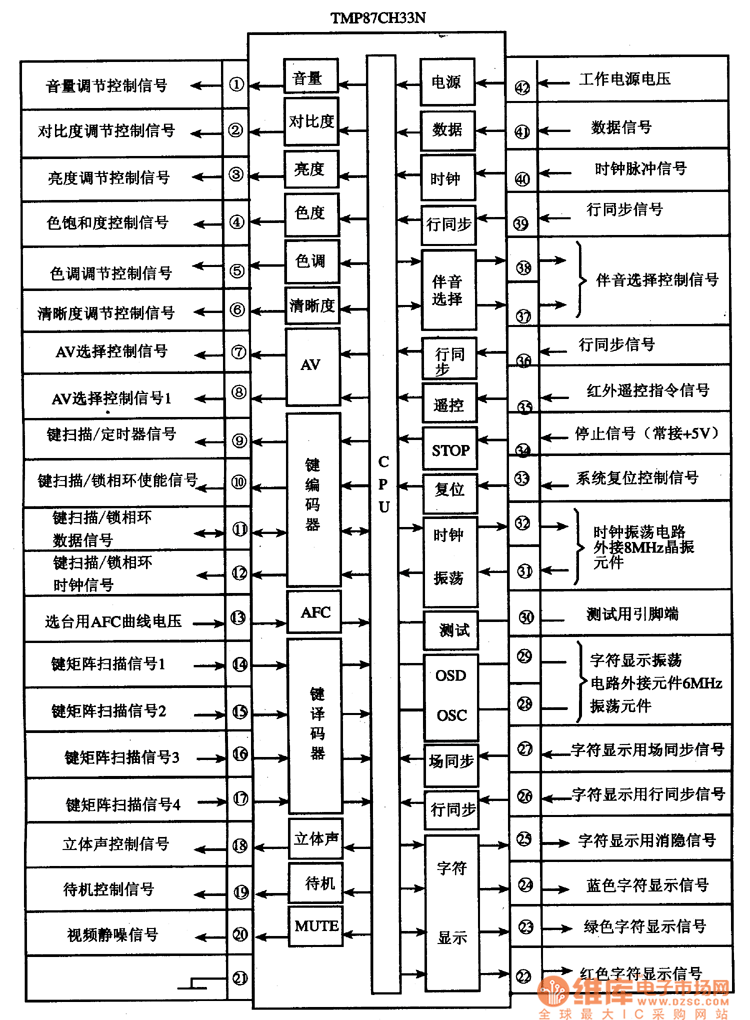 TMP87CH33N integrated circuit uses the plastic package with 42 feet in double rows, the pin functions and signal flowing are shown in Figure 1, the pin letter code and data are listed in Table 1.