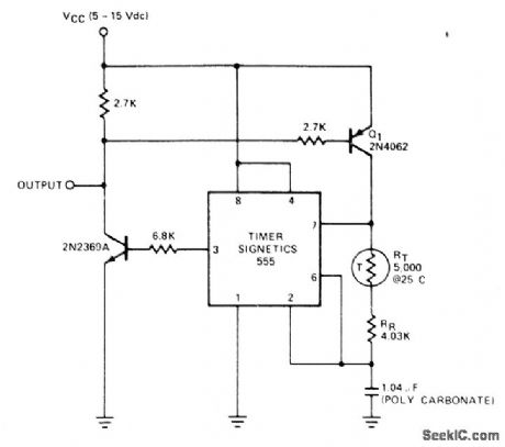 Thermistor and two transistors in charging network of 555 timer give outputfrequency that varies with temperature over 78°F range with accuracy of ±1 Hz. — Signetics Analog Data Manual, Signetics, Sunnyvale, CA, 1.977, p 731.