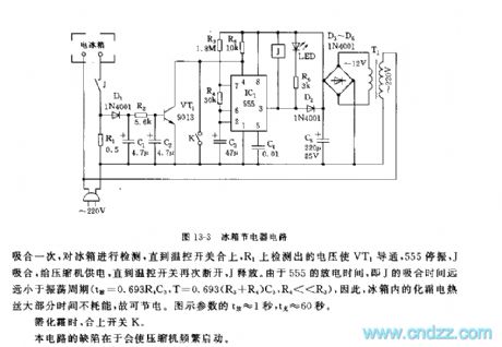 Customers often pay attention to the reduced power consumption of the fridge while its functions are not effected. The circuit shown in Figure 13-3 is applied in all types of two-door fridges, under the condition of not changing its internal control circuits, it can cut off the defrost heating wire in the fridge and save the power.The circuit consists of step-down rectifier circuit, test switch and oscillating control circuit,etc. 555,R2,R4 and C3 form the controllable oscillator, and the oscillator is under the control of the switch tube VT1. When VT1 is conducting, the 4-pin of 555 is in a low LEV and it stops oscillating.