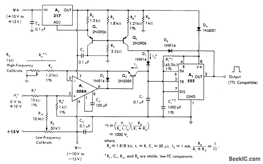 Control voltage input in range of 0 to -10 V is converted linearly to frequency of digital output pulse train haiving fullscale value of 10 kHz. Internal regulation of circuit makes operation essentially independent of ±15 V supply level.A1 is opamp integrator, A2 is comparator, and A3 is precision mono MVBR. Transistor switch Q1 connects Rb to 3.15-V reference voltage during t1 timing period of A3.—W.G.Jung, IC Timer Cookbook, Howard W.Sams, Indianapolis, IN, 1977, p184-192