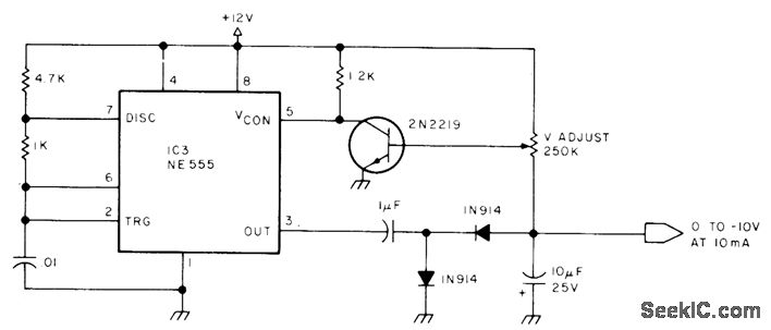 Variable-output converter using NE555 timer delivers negative output votage required by some interface devices and D/A converters used with microprocessors.—S. Ciarcia,Build a 5 W DC to DC Converter, BYTE,Oct,1978、p 22, 24, 26, 28, and 30-31.