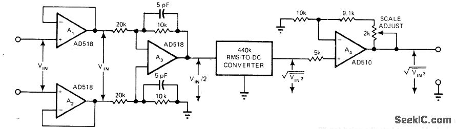 Provides accuracy within 0.1% for square-wave inputs of 3 to 7 VRMS in frequency range of 5 to 20 kHz when duty cycle is 50%. Opamps A1 and A2 are connected as differential input voltage-followers to provide high input impedance,A3 convolts to single-ended output as required by Model 440 convelter IC.A4 provides adjustable gain than roughly offsets attenuation of A3, with 2K pot being adiusted to provide desired ratio of DC output voltage to RMS value of input.—J. Renken, Differential High-Z RMS-DC Converter Has 0.1% Accuracy, EDN Magazine, May 5, 1977, p 114 and 116.