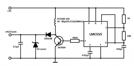 Here is another 1.5… 4.5V to 9V converter3 volt to 9 volt with LMC555This dc converter is built with the CMOS version of 555 timer. You can get 12V too if you change the zener diode to a 12V version.