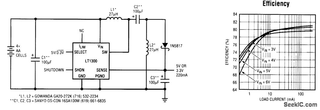 Converting the voltage from a four-cell battery pack to 5 V while using the full capacity of the batteries requires two modes of operation: step-down from an input voltage of 6 V and step-up from an input of 4 V (or less). A flyback topology can accomplish this, but uses a costly custom transformer. The LT1300 circuit shown utilizes the simple SEPIC topology, and is capable of 220 mA of output current at 5 V from a minimum 3-V input. The two inductors specified are available off the shelf. The circuit uses a boost section and a buck, or step-down, section, with the two inductors (L1 and L2) and two capacitors (C2 and C3) all acting as energy-storage elements. Efficiency is slightly less than that of a direct step up (see graph), but is better than that of an equivalent flyback configuration. Other features of the circuit include shutdown (10 μA max. supply current) with full input-to-output isolation, which allows the output to go to zero volts, yet present no load to the batteries.Also, either a 3.3-V or 5-V output can be selected by using the logic-select pin of the LT1300.