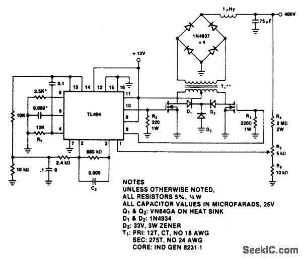 The TL494 switching regulator governs the operating frequency and regulates output voltage, Switching frequency approximately 100 kHz for the values shown。Output regulation IS typically 1.25% from no-load to full 60 W。