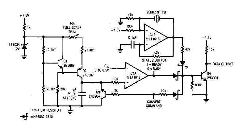The converter has a 60-ms conversion consumes 460 pA of 1's. 5 V power supply and maintains an accuracy of 10 bits on a 15 ° C in the temperature range of 35 ° C. A pulse applied to convert the command line causes Q3, operating in reverse mode, the discharge path through the diode 10 kO, forcing its collector low. Q3 results of reverse mode switching in a capacitor discharge to 1 mV of ground. During the time of the ramp value is less than the input voltage, output of the CIA is low.