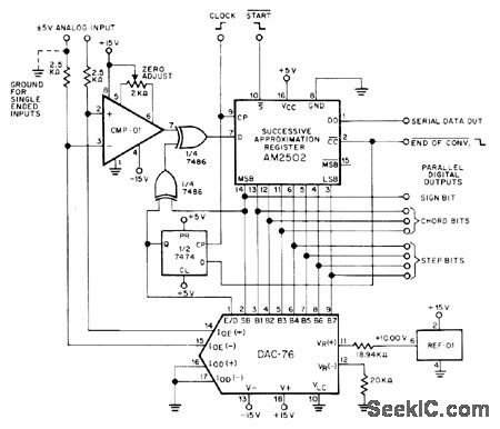 Step size increases as output changes from zero scale to full scale, in contrast to conventional linear converter in which step size is constant percentage of full scale. Uses Precision MonolithIcs DAC-76 D/A converter in combination with CMP-01 comparator, any standard EXCLUSIVE-OR gate, and successive-approximation register for conversion logic. Encoding sequence begins with sign-bit comparison and decision. Bits are con verted with successive-removal technique, starting with decision at code 011 1111 and turning off bits sequentially until all decisions have been made. Conversion is completed in nine clock cycles.— COMDAC Companding D/A Converter, Precision MonolithIcs, Santa Clara, CA, 1977, DAC-76, p 12.