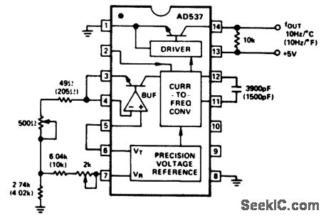 Celsius (Fahrenheit) temperature-to-frequency converter. No sensor is required since the AD537 has an internal VTEMP output. The converter output tracks the temperature at a rate of 10 hertz per degree Celsius or Fahrenheit, depending on the resistor-capacitor values chosen. All values in parentheses are for Fahrenheit. To calibrate measure the room temperature in Kelvin. Measure the temperature output at pin 6 at that temperature. Calculate the offset adjustment by dividing the VTEMP at pin 6 in milli volts by the room temperature in Kelvin, then multiplying by 273.2 The offset voltage will be in milli volts. Then disconnect the 49-ohm resistor and adjust the 2K pot for the offset voltage at pin 7. Connect the 49dm resistor. Then adjust the 500-ohm slope trimmer for room temperature, or 25℃, which results in 250 hertz (courtesy Analog Devices, Inc.).