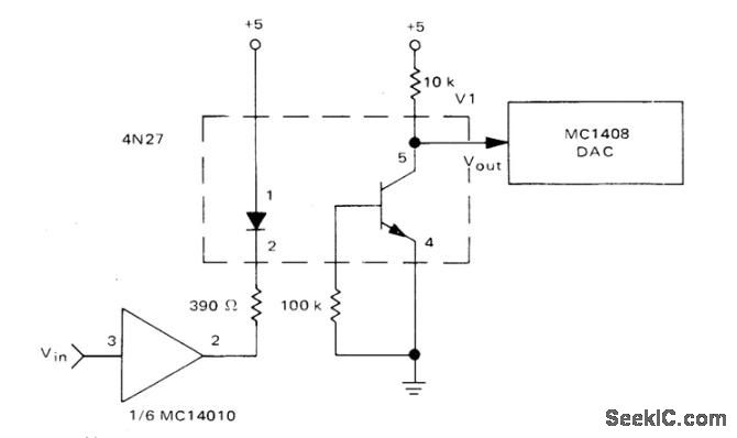 Motorola 4N27 optoisolator provides required isolation between DAC of programmable power supply and remotely located CMOS MC14010 noninverting buffer.-D. Aldridge and N. Wellenstein, Designing Digitally-Controlled Power Supplies, Motorola, Phoenix, AZ, 1975, AN-703, p 9.