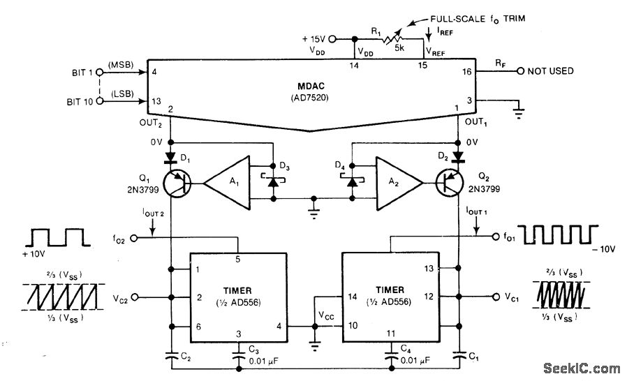Combination of multiplying DAC and 556 dual timer provides complementary output frequencies under con trol of digital input. Opamp and diode types are not critical. Output frequency of each timer depends on supply voltages, capacitor values,and setting of R1.-J. Wilson and J. Whitmore,MDAC's Open Up a New World of Digital-Control Applications,EDN Magazine,Sept.20、1978、p 97-105.