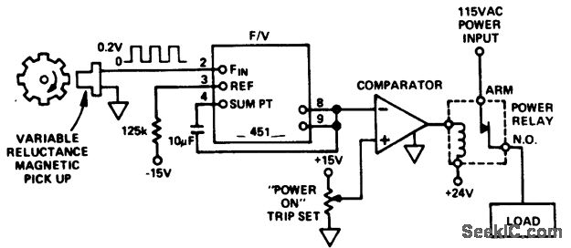 F/V converter controlling power load. The relay remains open until the preset power on trip level is reached (courtesy Analog Devices, Inc.).
