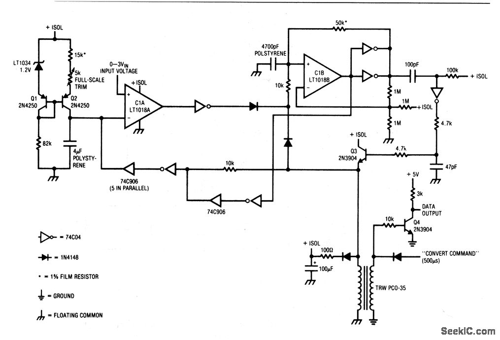 This circuit is fully floating from system ground, and is ideal for performing A/D conversion in the face of the high common-mode noise characteristics of predominantly digital systems. The circuit is also useful in industrial environments where noise and high common-mode voltages are present in transducer-fed systems. To calibrate, apply 3.000 V at the input, and trim the 5-kΩ pot for 1024 counts at the data output (Q4 collector).