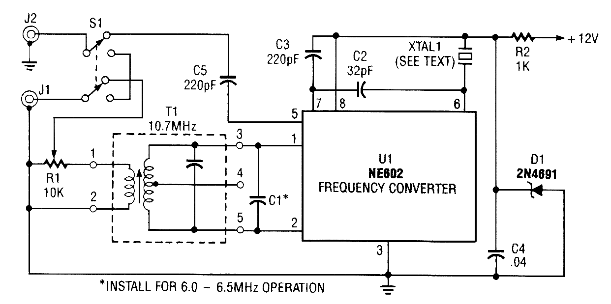 The NE602 chip, U1, contains oscillator and mixer stages. The mixer combines the oscillator sig-nal with the input RE signal to produce signals whose frequencies are the sum and difference of the input frequencies. For example, an 8.5-MHz oscillator and a 10-MHz incoming signal will give output signals at 18.5 MHz (10 + 8.5) and 1.5 MHz (10 - 8.5). Recall that 1.5 MHz is 1500 kHz and an ordinary AM radio will tune to it.The choice of crystal depends on what shortwave band you want to hear. The 9.5- to 10-MHz band is less crowded and includes the time-signal station WWW. For that band, you'll need a crystal of 8.5 to 8.9 MHz. There is no standard microprocessor crystal in that range, but you can use an am-ateur radio crystal, have a crystal custom-made, or use a CB crystal.Transformer T1 rejects signals that are outside the band you are interested in. Transformer T1 should pass signals from 9 to 11 MHz and attenuate all others. The transformer, T1, used in the circuit is a 10.7-MHz IF transformer salvaged from an FM radio.They are fairly easy to obtain new from parts stores and mail-order houses. Most 10.7-MHz IF trans-formers will tune across the 9.5- to 10-MHz band without modification; all you need to do is turn its tuning slug. To receive the 6.0- to 6.5-MHz shortwave band, you'll have to add a 150-pF capacitor.