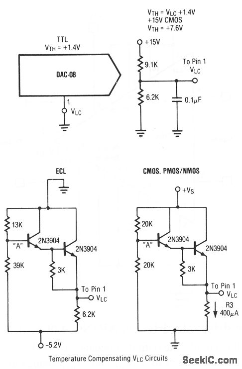 This circuit shows the interface circuits that are required to interface a typical TTL DAC with ECL,CMOS, PMOS, and NMOS digital devices. Raytheon Linear Integrated Circuits, 1989, p. 6-15.