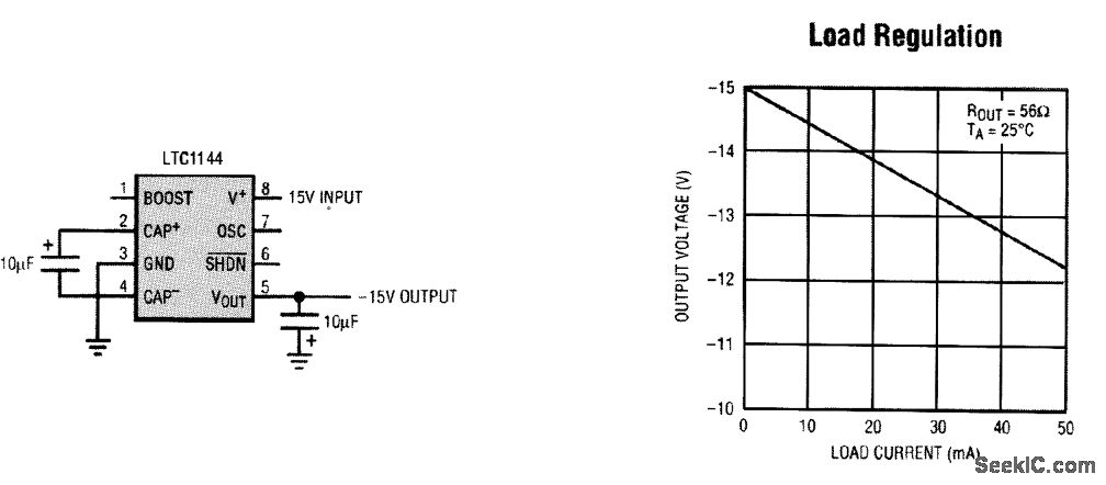 Switched capacitor voltage converters are a convenient way to generate a local negative supply for biasing special circuitry, but have been limited by CMOS processes to 10 V of supply or less. The LTC1144 voltage converter overcomes this limitation, extending the maximum input voltage to 20 V. Still, the part retains the low power of CMOS operation. The LTC1144 circuit shown here generates a negative supply voltage of -13.8 V typ. (-12.6 Vmin) from a 15-V input at a maximum load current of 20 mA. Higher load currents are possible at slightly lower output voltages. The low-cost circuit includes two surface-mount capacitors, minimizing board space. A supply current of 1.2 mA (max.) results in high conversion efficiency, while just 8 μA of supply current is consumed in shutdown, making the LTC1144 excellent for use in battery-powered systems.