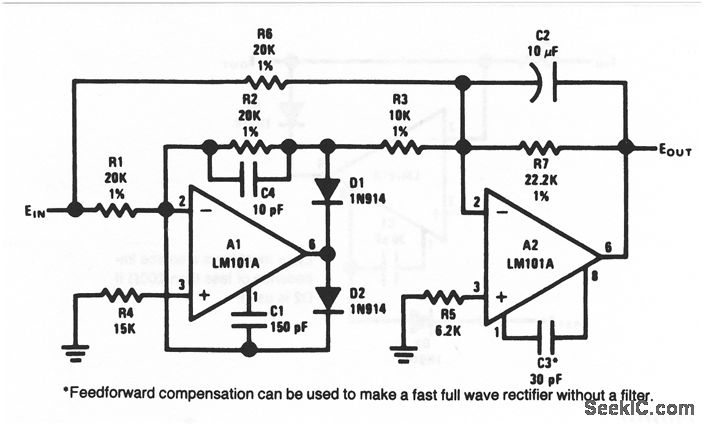 This circuit converts the half-wave rectifier or Fig. 10-39 to a full-wave rectifier. The conversion accuracy is better than 1% to above 100 kHz, with less than 1% ripple at 20 Hz. Using the values shown, the output is calibrated to read the rms value of a sine-wave input.