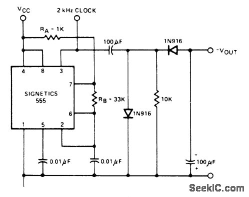 Used to derive negative supply voltage from positive supply voltage, while at same time generating 2-kHz dock signal, Negative output voltage tracks DC input voltage linearly, but magnitude is about 3 V lower. Circuit does not provide regulation.— Signetics Analog Data Manual, Signetics, Sunnyvale, CA, 1977, p 729.