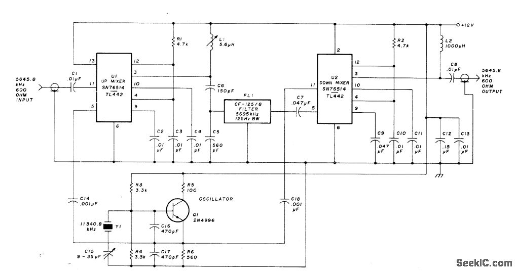 Circuit shown was developed for use in 5645.8-kHz IF amplifier of Drake R-4B amateur-band receiver, to utilize high-performance characteristics of Sherwood Engineering CF-125/8 CW crystal filter having bandwidth of only 125 Hz. Texas Instruments TL442 double-balanced mixers convert IF signal to 5695-kHz center frequency of filter and convert filter output back to IF value. Same crystal oscillator serves for both upconversion and downconversion. Gives true single-signal reception. Article covets procedures for interfacing any crystal filter with any receiver IF value. -H. Sartori, An Up/Down Filter Converter, Ham Radio, Dee. 1977, p 20-25.