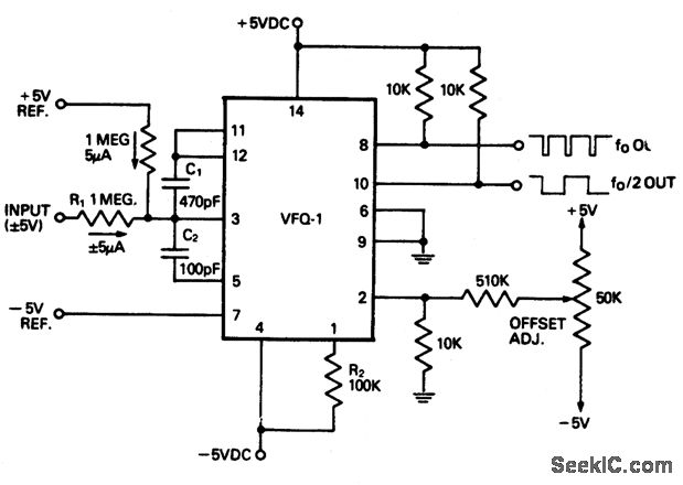 Voltage-to-frequency converter for bipolar operation. Full scale output is 20 kHz.Chip used is the Datel VFQ-1 14-pin DIP.outputs at fo and fo/2 are possible(courtesy Datel Systems, Inc.).