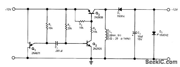 Transformerless inverting DC-to-DC converter has above 55% effciency and can withstand output shorts lasting up to several minutes. UJT Q1 and base-emitter diode of transistor Q2 from free-running MVBR whose 25-kHz output is amplified by Q2 to drive switching-mode converter Q3-L1-D1-C2. Zener D2 regulates output for variations in input voltage or output loads up to 40 mA.—G. Bank, Transformerless Converter Supplies Inverted Output, EDN|EEE Magazine, July 1, 1971, p 48.