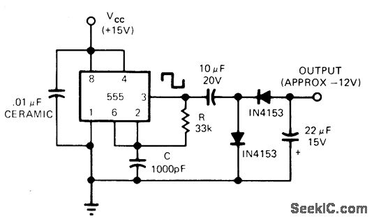 Simple transformerless power converter uses 555 timer in self-triggered mode as square-wave generator, followed by voltage-doubling rectifier. Values shown for R and C give frequency of about 20 kHz, which permits good filtering with relatively small capacitors. Maximum load current is about 80 mA.—M. Strange, IC Timer Makes Transformerless Power Converter, EDN Magazine, Dec. 20, 1973,p 81.