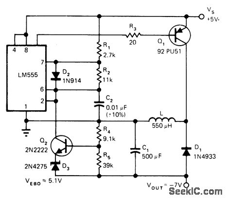 Uses LM555 timer as variable-duty-cycle pulse generator controlling transistor switchQ1 which in turn drivesflyback circuit.Regulator Q2-D3-R4-R5 varies duty cycle according to load, and flyback circuit L-D1-C1 develops negative output voltage. When Q1 is on, current flows through L to ground. When Q1 turns off, polarity across L reverses, diode becomes forward-biased, and negative voltage appears across C1 and load. When Q1 turns on again, voltage across L reverses for start of new cycle. Circuit eliminates separate transformer supply for negative supply of microprocessor. Efficiency is about 60%, load regulation 1.3%, and supply rejection 30 dB. Article gives design equations.—P. Brown, Jr., Converter Generates Negative μP Bias Voltage from +5V, EDN Magazine, Aug.5, 1977, p 42, 44, and 46.