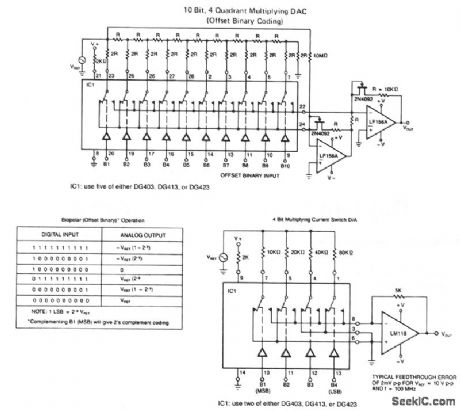 This circuit shows a DAC/op-amp combination that is used to provide symmetrical-offset operation. Full-scale adjustment can be made as shown in Fig.6-39B. (View)