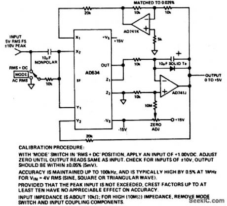 Wide-band high-crest-factor PMS-to-DC converter using an AD534 multiplier/divider chip (courtesy Analog Devices, Inc.). (View)