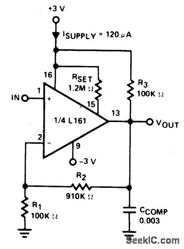 Amplifier is 3 dB down at 100 kHz and has a slew rate of 0.02V/μ sec.
