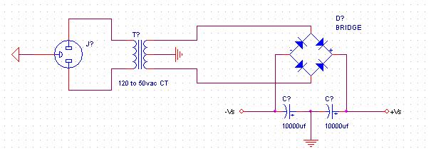 Power-supply:I used a 110 volts to 50 volts ac transforer with a center tap. (this means +50 volts and -50volts). Next, I rectify the current with a diode bridge(big enough for 8A), and I filter with 2 big capacitors of 10000uf each.