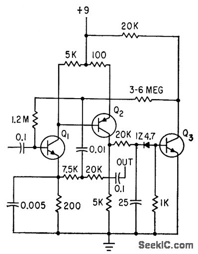 Input impedance is over 1 meg. Can be used in microphone case to raise power level of signal above that of interference. Both positive and negative feedback are used. Q1 and Q3 are 2N1086A, and Q2 is 2N414.-J. J. Tiemann, Transistor Amplifier with Adjustable Impedance and Gain, Electronics, 35:15, p 68-69.