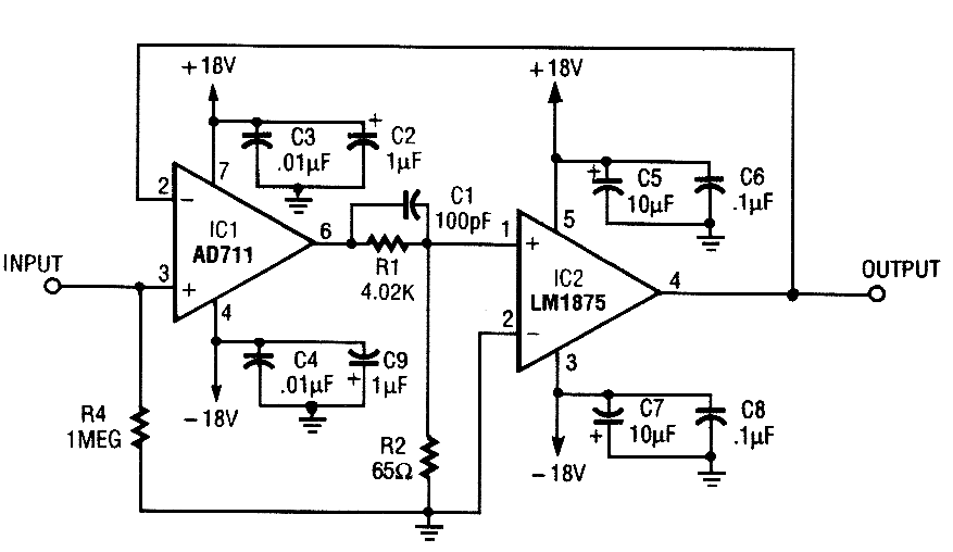 Using an LM1875,a 10-W amplifier can bebuild using just two IC devices The gam=R4/R3. Note that IC12 must be heatsinked