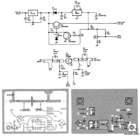 Using an NEC70083, this 1296-MHz amplifier delivers about 17-dB gain and around 1- to 1.5-dB noise. It is constructed on a G-10 epoxy fiberglass PC board. Use the layout shown because this is impor-tant for correct performance.The power supply/regulator delivers the regulated 3-Vdc for the drain circuit and U2 produces a nega-tive bias for the gate circuit. R5 sets the drain voltage to+3 V and R3 sets the gate bias. Typically, the drain current is about 10 mA.