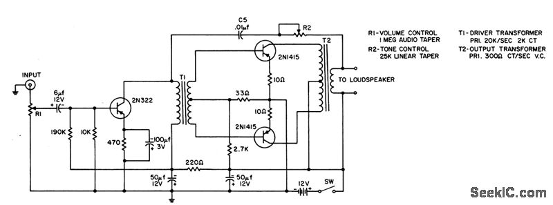 Input sensitivity is 10 to 20 mv for 0.5 w output. Maximum power output at 10% harmonic distortion is 500 mw. Design calculations are given.- Transistor Manual, Seventh Edition, General Electric Co., 1964, p 246.