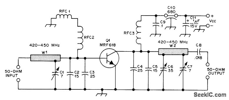Power gain of 10 dB increases effective range of amateur transmitter. Narrow-band amplifier using Motorola MRF618 internally matched 12.5-V controlled-a transistor can be tuned from 430 to 450 MHz. Multiple L sections using 50-ohm microstrip line and mica compression variable capacitors provide input-match and collector-load transformations. Article gives printed-circuit board layout for U-shaped 0.112-inch-wide stripline inductors W1 and W2. RFC1 is ferrite bead, RFC2 is 8 turns No. 22 enamel closewound on 1/8-inch form, and RFC3 is 4 turns No. 22 enamel closewound on 1/4-inch form.-R. Olsen, Build This Solid-State PA for 440 MHz, QST, Feb. 1977, p 37-38.