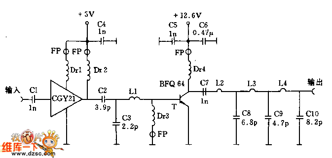 1W superhigh frequency power amplifier circuit is shown in the following diagram: