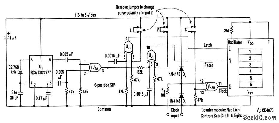 By differentiating, inverting, and ORing the clock pulses in XOR gate U2A, a stream of 1-Hz, positive, 200-μs pulses is generated. For latching, the 1-Hz stream is again differentiated in U2B, input 1 to supply a 50-μs pulse. Though U2B's output goes from high to low, it can be reversed, by making input 2 low.