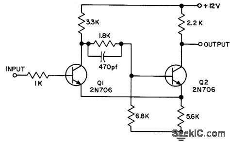 Q1 conducts when input exceeds 6.8 v. Q2 always conducts if input is below 5.2 v. Ambient temperature range is 0 to 71℃. Output at collector has 2 v minimum level change.- Transistor Manual, Seventh Edition, Geneml Electric Co., 1964, p 200.