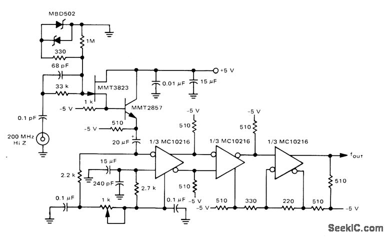 Developed for use ahead of prescaler in 200-MHz auto ranging frequency counter. Provides high input impedance to count-sensing device. Circuit includes Schmitt trigger action. Sensitivity is about 50 mV P-P.-T. Balph, A 200 MHz Autoranging MECL-McMOS Frequency Counter, Motorola, Phoenix, AZ, 1975, AN-742,p 10.
