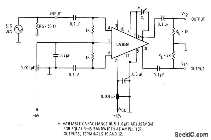 RCA CA3040 IC is connected for single-ended input and balanced output, with no resonant circuits. Gain is above 30 dB over wide frequency range.-E. M. Noll, Linear IC Principles, Experiments, and Proiects, Howard W. Sams, Indianapolis, IN, 1974, p 162-163 and 168.