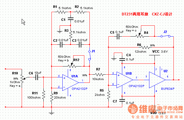 R4 is a low frequency upgrading adjustable resistor replaced by the 12K fixed resistor, and then, it will gradually increase under 100Hz, reach 5-6dB (2 times) under 50Hz, no upgrade above 100Hz. R12 is the If adjustable resistor and replaced by 30K fixed resistors, it makes 2.5-4.5KHz frequency increase, and the band upgrade approximately 6 dB (2 times). If you feel harsh, it needs to add RC, double T decreases. For a fixed resistor, in addition to enhance the band, the circuit overall voltage amplification factor is 3 times, it is enough to push down the headset.J1, J2 are the linkage switch, you can choose generic options or DT231-specific amp. Due toit upgrade little, Q value is not high, the relative frequency change is not great. Due to circuit change little, Q value is not high, the relative frequency change is not great.