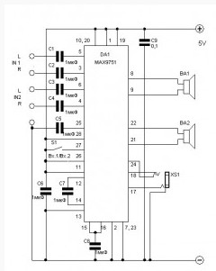 This amplifier circuit based MAX9751 IC which work on the 5 Volt voltage, unipolar, and a 2.6 Watt power output per channel. In addition, there is a headphone output with separate amplifier and the input selector inputs – you can connect two sources of signal.