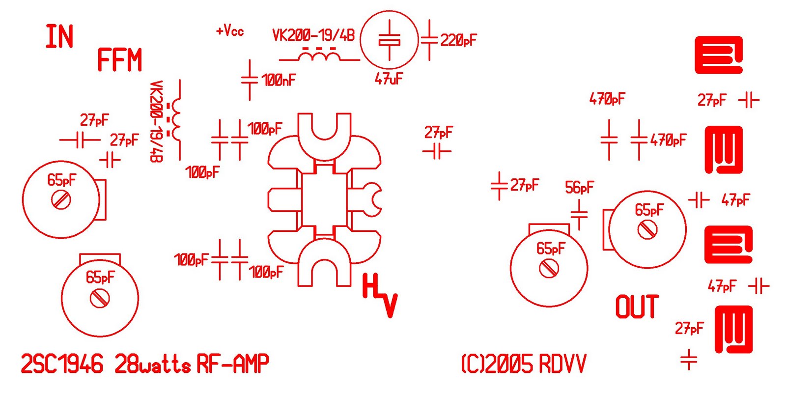 This RF Amplifier designed for FM broadcast using a single 2SC1946 VHF Power Transistor. This 10-30W RF amplifier circuit provides an appropriate power boost with an input of 1-3 watt. Tower are 30 meters high will send signal surrounding air should be around 15 km. The layout of the 2SC1946 28 Watts FM broadcast RF amplifier has been created with Eagle. The pcb outline is 100 x 50 mm (width x height), all bitmaps have a resolution of 600dpi.Use FR-4 single sided photoresist epoxy pcb material for best results.