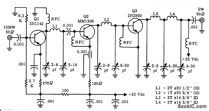 Uses 2N2950 npn silicon planar epitaxial transistor designed for medium-power high-frequency applications. Overall gain is 23 db. Intended for f-m or c-w applications only. For a-m, supply voltage on final stage must be reduced lo 12 v lo remain within voltage rating, and driver should also be 2N2950.-D. L. Adley, Designing 160 Mc FM or CR Circuitry Using a Silicon High Frequency Transistor, Motorola Application Note AN-168, Aug. 1965.