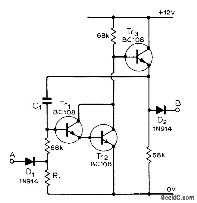 Used in multiple timer for development of photographic paper, in which six independent timers are started in sequence as each sheet of exposed paper is placed in developer. C1 is 1 μF and R1 is 11 megohms for 2-min timer having accuracy within 5 s. Article gives all other circuits required and suggests modifications to meet other needs. Output B drives meter and trigger circuit for audible alarm.Timer is started by input switch connected to A.-R. G. Wicker, Photographic Development Timer, Wireless World, April 1974, p 87-90.