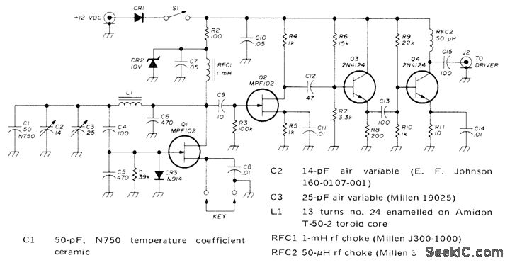 Uses quarter-wavelength transmission line T3 in place of parallel-tuned traps to pass even-harmonic currentfreelywh"e blocking odd harmonics Circuit canbe adapted to 300-mW、fvalkie-talkie for 6 or 10meters At 25 MHz、efficiency is 73%,-F, H,Raab,High-Efficiency RF Power Amplifiers,Ham Radio,Oct 1974,p 8-29.
